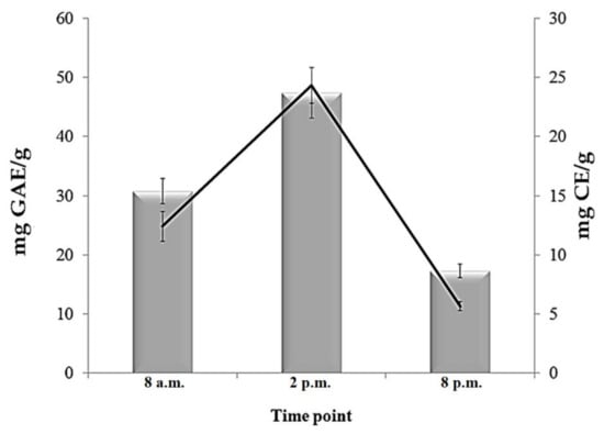 The P. amboinicus essential oil has been reported to consist of 76 volatile constituents, and the oil is rich with oxygenated monoterpenes, monoterpene hydrocarbons, oxygenated sesquiterpenes, and sesquiterpene hydrocarbons, whereby thymol and carvacrol are the two major phenolic compounds [1,19]. Figure 5 exhibits the TPC and TFC of P. amboinicus essential oil analyzed at three different time points. Data demonstrated that the highest values of TPC and TFC were recorded at 2 p.m. and the lowest at 8 p.m. Notably, bioactive compound accumulation varies in different plants and is dependent on numerous factors, including light exposure and temperature [20]. To further investigate this issue, GC-MS analysis was conducted to identify the essential oil components at the same three time points.