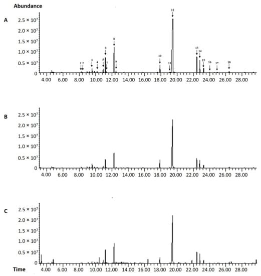 Figure 6. Chromatographic profiles of Plectranthus amboinicus essential oil extracted from leaves harvested at different time points. (A) 8 a.m.; (B) 2 p.m., and (C) 8 p.m. The numbers (as indicated by the black arrow) correspond to the terpenoids detected as described in Table 1.