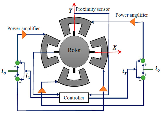 Figure 2 depicts a schematic diagram for the twelve-pole rotor system. The rotor is investigated as a two-degree-of-freedom system that oscillates in and directions. The twelve electromagnetic poles are responsible for controlling the system vibrations via generating controllable attractive forces and in both the horizontal and vertical directions, respectively. Therefore, the differential equations that govern the system motion can be expressed as follows [38,39]: