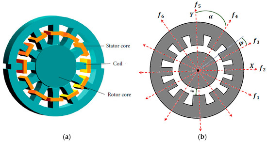 where is the rotor mass, and are the horizontal and vertical accelerations of the rotor system, is the eccentricity of the rotating disc, is the disc angular speed, and and are the net attractive forces of the twelve poles in - and -direction. By considering the symmetric design of the twelve-pole system, the attractive force of each opposite pair of the poles ) can be expressed as follows [39]: