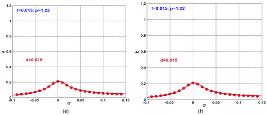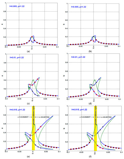 The influence of the second control parameter (i.e., the derivative gain ) on the dynamical behaviors of the twelve-pole system is discussed through Figure 12, Figure 13, Figure 14, Figure 15, Figure 16, Figure 17 and Figure 18. In Figure 12, the twelve-pole system steady-state oscillation amplitudes are plotted against the detuning parameter at various values of the derivative gain (i.e., when and ) when fixing the eccentricity and the proportional gain constant so that and . Comparing Figure 12a,b with Figure 12c,d, it is noticed that the increase in from to eliminates the unstable motions of the twelve-pole system that appeared in Figure 12a,b and reduces the vibration amplitudes of the rotor system. However, Figure 12c,d show that the system has a bistable solution near the perfect resonance (i.e., when ), and the nonlinearity characteristics still dominate the rotor response. However, when increasing the derivative gain from to , as depicted in Figure 12e,f, it forces the twelve-pole system to respond linearly where the bifurcations of the motions are suppressed.