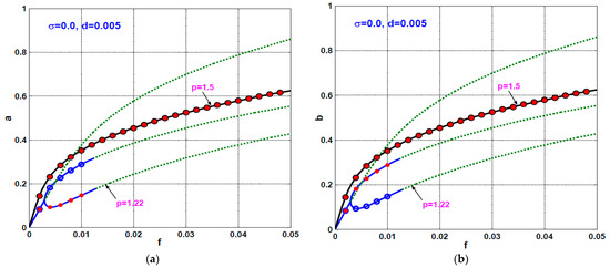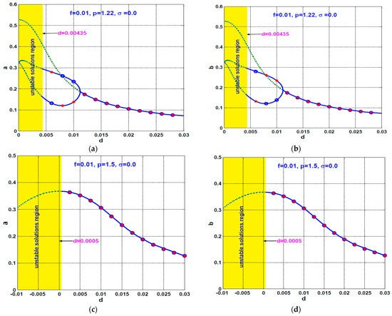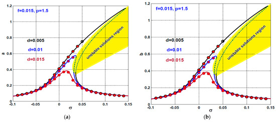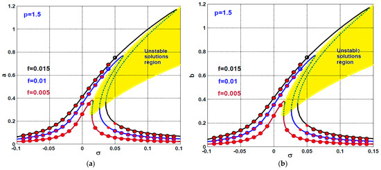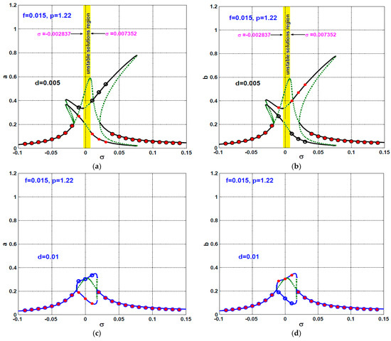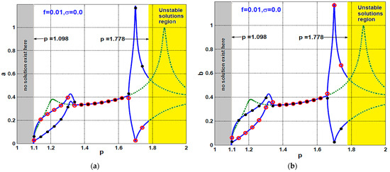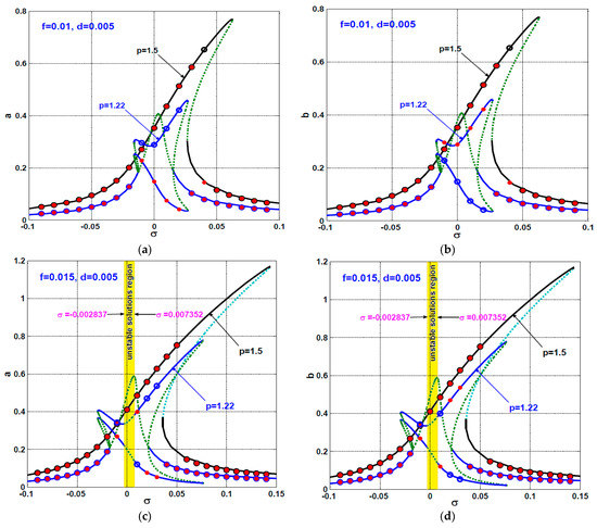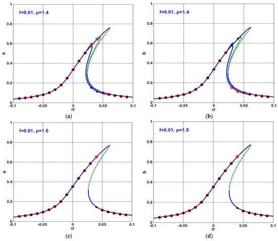 Depending on the mathematical modeling and analysis given above, the bifurcation behaviors, stability conditions, and control performance of the twelve-pole rotor system are discussed in this section. The steady-state vibration amplitudes ( and ) of the twelve-pole rotor are plotted versus the different parameters by solving the derived nonlinear algebraic Equations (34)–(37). In addition, the stability of these amplitudes is studied via the exploration of the eigen values of Equation (40). In all response curves (i.e., Figures 3–6, 12–14, 19–21 and 25), the solid lines represent the stable solution, and the dotted lines refer to the unstable solutions. As Equations (34)–(37) govern the steady-state oscillation amplitudes of the rotor system that is governed by Equations (8) and (9), numerical simulations for the plotted response curves are performed by solving Equations (8) and (9) using the Runge–Kutta algorithm. The steady-stated oscillation amplitudes that were obtained numerically by solving Equations (8) and (9) are plotted as small-circles (when sweeping the bifurcation parameter forward) and as big-dots (when sweeping the bifurcation parameter backward). The analytical and numerical results are obtained by adopting the following values of the system parameters unless otherwise is mentioned: , and [2,3,4,5,6,7,8,9,10].