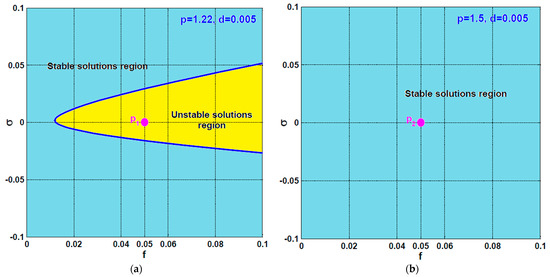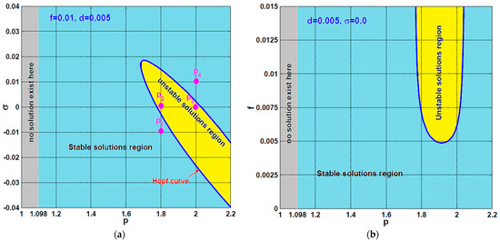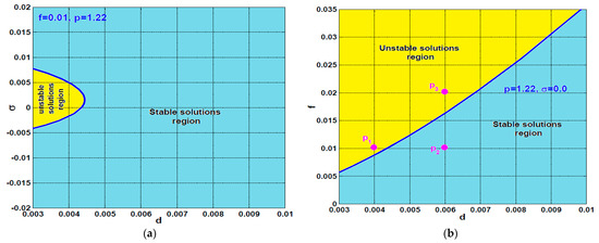 To obtain the stability boundaries of proportional control gain in more general form, the stability charts for the twelve-pole system are obtained in both and planes, as in Figure 7. The figure illustrates that the system has no solution as long regardless of the values of and , as demonstrated in Figure 7a,b, respectively, where the absence of the solution depends on the magnitude of and hence the magnitude of the natural frequency as explained above.