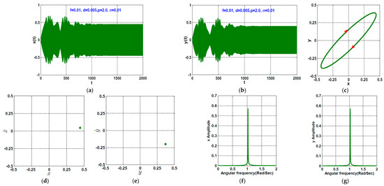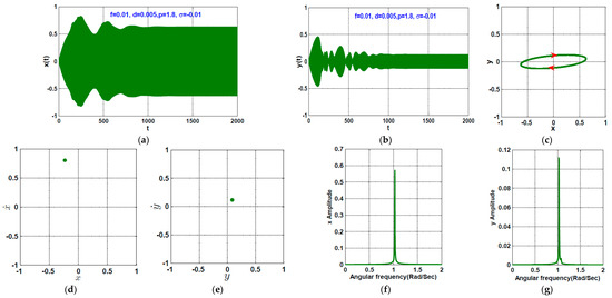 To investigate the accuracy of the obtained stability charts shown in Figure 7, a numerical simulation for the twelve-pole system (i.e., solving Equations (8) and (9) using MATLAB ODE45) according to four points , and that are shown in Figure 7a and are introduced in Figure 8, Figure 9, Figure 10, Figure 11. It is clear that the point is located within the stable solution region. Accordingly, it is expected that the twelve-pole rotor to respond with stable periodic oscillation when tuning the system parameters such that and . Figure 8 shows the temporal dynamics of the twelve-pole system according to the point (i.e., and ), where Figure 8a,b show the instantaneous oscillations of the system, and Figure 8c illustrates the steady-state periodic orbit. In addition, both the corresponding Poincaré-map and frequency spectrum for the system temporal oscillations is constructed, as shown in Figure 8d–g. In general, Figure 8 confirms the stable periodic motion for the studied system at and , where the orbital motion, the Poincaré-map, and the frequency spectrum demonstrate that the temporal oscillations contain a single frequency component.