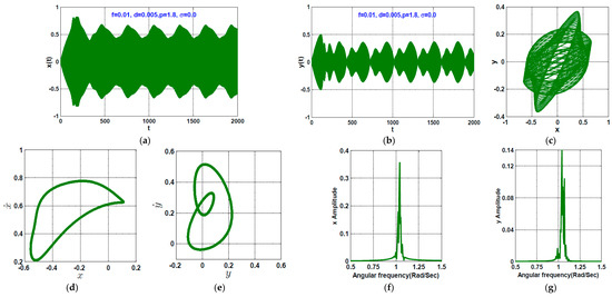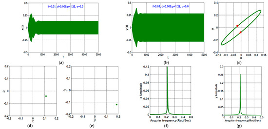 To validate the accuracy of the obtained stability charts shown in Figure 15, a numerical simulation for the rotor system according to the three marked points (i.e., the points and ) in Figure 15b is performed, as shown in Figure 16, Figure 17 and Figure 18. Figure 16 simulates the temporal oscillations of the rotor system according to the point (i.e., and ) that is marked in Figure 15b within the unstable solutions region. Figure 16a,b shows the instantaneous vibrations of the twelve-pole system in and directions, while Figure 16c shows the corresponding steady-state orbital motion. In addition, the Poincaré-map and frequency spectrum are shown in Figure 16d–g. Figure 16a–c confirm that the system performs unstable periodic motion when simulated according to the point that agrees with the stability chart given in Figure 15b. Moreover, Figure 16d–g demonstrate that the rotor system performs a quasiperiodic motion. The numerical simulations of the rotor temporal oscillations according to the points and shown in Figure 15b have been illustrated in Figure 17 and Figure 18, respectively. Now, by comparing Figure 16, Figure 17 and Figure 18 with the three marked points ( and ) shown in Figure 15b, we can confirm the accurate correspondence among the obtained stability chart and the numerical simulations.