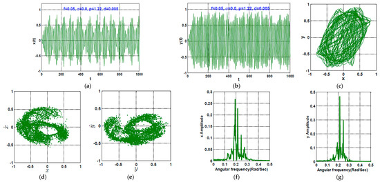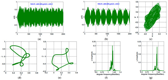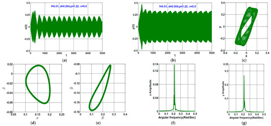 Numerical simulation for the twelve-pole system according to the marked point in Figure 6a (i.e., when ): (a,b) temporal oscillations, (c) orbital motion, (d,e) Poincaré return map, and (f,g) frequency spectrum.