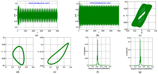 Numerical simulation for the twelve-pole system according to the marked point in Figure 21a (i.e., when ): (a,b) temporal oscillation, (c) orbital motion, (d,e) Poincaré return map, and (f,g) frequency spectrum.