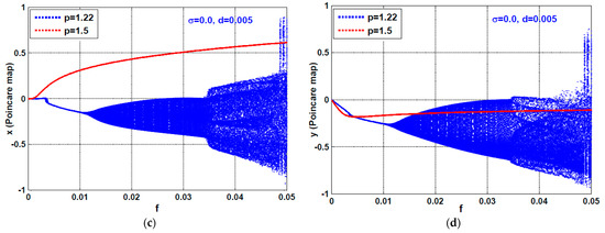 Finally, the bifurcation behaviors of the twelve-pole system when utilizing the eccentricity as the bifurcation control parameter is discussed through Figure 19, Figure 20 and Figure 21, where Figure 19a,b shows the system amplitudes () versus the rotor eccentricity when at various values of the proportional gain (i.e., when and ). It is clear from Figure 19a,b that the twelve-pole system exhibits complex bifurcations behavior at . In addition, the figure confirms that the system loses its stability at acritical values of the eccentricity. However, the same Figures (Figure 19a,b) illustrate that the rotor system has a unique stable solution along the axis when fixing the proportional control gain to be . Accordingly, we can conclude that the twelve-pole system is robust against instability when subjected to large eccentricities when setting . Depending on Figure 19a,b, the system bifurcation diagrams are established, as shown in Figure 19c,d, utilizing as the bifurcation parameter when and . The bifurcation diagrams in Figure 19c,d are obtained via plotting the Poincaré-map of Equations (8) and (9) versus the eccentricity with a step-size and zero initial conditions. Comparing Figure 19a,b with Figure 19c,d, we can confirm the excellent corresponding between the analytic (i.e., Figure 19a,b) and numerical (i.e., Figure 19c,d) results. Figure 20 and Figure 21 are a repetition for Figure 19, but when and , respectively. By examining Figure 19, Figure 20 and Figure 21 carefully, we can notice three important phenomena. The first one is that the detuning parameter has a great influence on the critical value of the eccentricity at which the system may lose its stability when . The second phenomenon is that the twelve-pole system is stable along the axis regardless of the magnitudes of if the proportional gain . The third phenomenon is that the steady-state oscillation amplitudes when are greater than the steady-state oscillation amplitudes at along the stable interval of the axis.