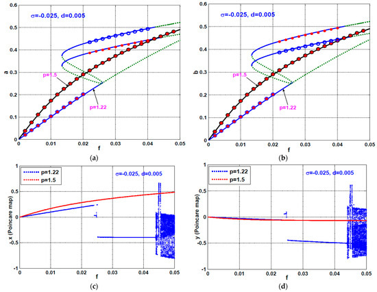 (a,b) Oscillation amplitudes of the twelve-pole system versus , and (c,d) the corresponding bifurcation diagrams at when and .