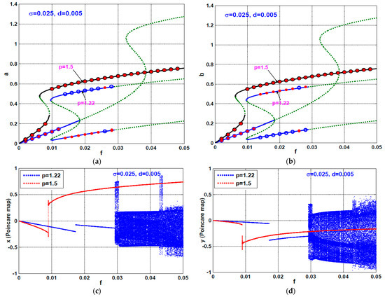The twelve-pole dynamics at different values of the proportional gain is explored through Figure 4, where Figure 4a,b show the system steady-state vibrations against at , while Figure 4c,d depict the system steady-state vibrations against at when fixing the eccentricity at . Comparing Figure 3c,d with Figure 4c,d, we can notice two important phenomena. The first phenomenon (positive phenomenon) is that the system dynamical behaviors became simpler when increasing as in Figure 3c,d to as in Figure 4c,d, where the system exhibits a response similar to a Duffing oscillator with hard spring characteristics. The second phenomenon (negative phenomenon) is that the vibration amplitudes () at are about twice the oscillation amplitudes when .