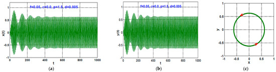 Numerical simulation for the twelve-pole system according to the marked point in Figure 21b (i.e., when ): (a,b) temporal oscillation, and (c) orbital motion.