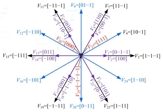 The simplified circuit topology of the 3L-NPC inverter is illustrated in Figure 1, where the output terminal is, respectively, linked to the positive-bus “P”, negative-bus “N”, or specifically linked to the neutral-point “O” via a diode-clamping circuit. In this way, the 3L-NPC inverter can theoretically produce three different voltage level outputs and 27 voltage vectors, as shown in Figure 2.