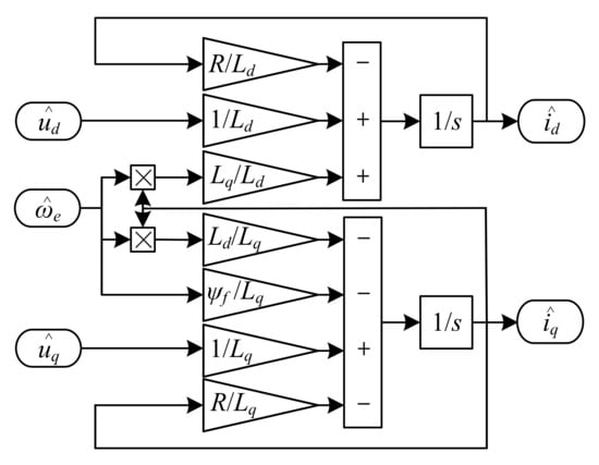 It is obvious that estimated values of the d–q-axes currents can be obtained when , , and are all clear. As such, a current observer can be constructed according to the adjustable model of the d–q-axes current, as shown in Figure 5, where , , are defined as the input value.