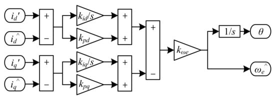 As mentioned previously, to further obtain rotor position information, the electric angular velocity tracking error should be calculated. As can be seen from (10) and (11), when = id’ and = iq’, will be equal to ωe. Therefore, if (11) is subtracted from (10), the existing observed current can be utilized to build the following mathematical model