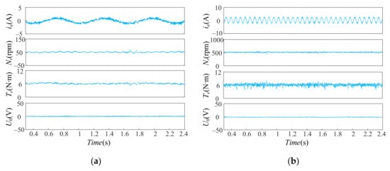 Experimental results in a steady-state with a 6 N∙m torque command: (a) 50 rpm speed command; (b) 500 rpm speed command.