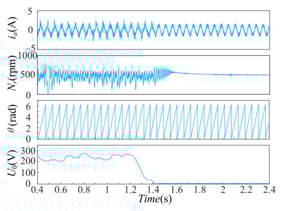 Furthermore, experimental waveforms considering the NPV balance are displayed in Figure 9. Certainly, both phase-A current and the rotor position angle are severely distorted, and the NPV increases to approximately 200 V before the control strategy is introduced. In particular, the motor speed produces large oscillations so that the whole system is out of control. Comparatively, speed can remain steady around 500 rpm, and the phase-A current changes into a nearly sinusoidal waveform once the NPV balance control is involved. In the meantime, the NPV returns quickly to 0 V within 200 ms, which is in accordance with the theoretical analysis. Overall, the proposed sensorless scheme gives an advantageous performance in terms of the neutral-point voltage balance.