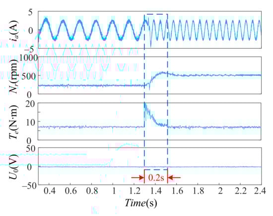 In addition, the torque step-change test is executed at 300 rpm, as shown in Figure 14. It can be observed that the response torque step-change is completed within 200 ms, where the torque is abruptly decreased from 6 N∙m to 0 N∙m. The neutral-point voltage can be kept as a constant value of 0 V during the entire transient process, while the phase-A current and speed are all regulated to follow the load change in view of a negligible overshoot of speed occurring in the process of the load step-change. Meanwhile, a dynamic tracking waveform of speed and rotor position at the torque step-change is exhibited in Figure 15. It is worthwhile noting that both speed-tracking performance and position-tracking performance are acceptable and remain unchanged in the process of the torque step-change. Although the high-frequency oscillations (and even some spikes) in the feedback signal may directly result in the output of controller performance at the same oscillations, on the whole, the proposed sensorless scheme can obtain an acceptable quick dynamic response performance.