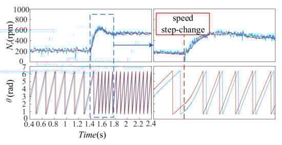 Tracking performances of speed and position during the speed step-change (the red line represents the actual value, and the blue line represents the estimated value).