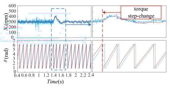 Tracking performances of speed and position during the torque step-change (the red line represents the actual value, and the blue line represents the estimated value).