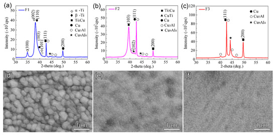 XRD results and SEM images of the Cu-Ti films on C61900 Cu alloy: (a,d) for F1, (b,e) for F2, (c,f) for F3.