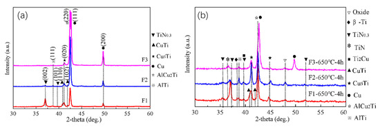 The three Cu-Ti films prepared on the C61900 Cu alloy were then treated by plasma nitriding at 650 °C for 4 h. Except for the Cu-Ti intermetallics and Ti-N compounds, an AlCu2Ti phase also formed after plasma nitriding, as shown in Figure 2a. The grazing incidence XRD of the Cu-Ti films after nitriding at 650 °C indicated that the TiN and TiN0.3 phases existed in the outmost layer, and the diffraction peak of the Cu3Ti and AlTi phases in the F2 film coated surface was enhanced simultaneously after nitriding at 650 °C for 4 h, as shown in Figure 2b.