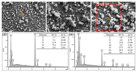 Surface morphology and the EDS results for the Cu-Ti film on C61900 Cu alloy after plasma nitriding at 650 °C for 4 h: (a) F1, (b) F2, (c) F3, (d) EDS result for point A in (a), (e) EDS result for region B in (c).