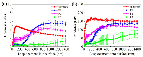 The change in the hardness and elastic modulus of C61900 Cu alloy with increasing indented depth is shown in Figure 4. The hardness of the unmodified C61900 Cu alloy substrate increased rapidly up to 6 GPa and then decreased gradually with the growth of depth, which was kept constant at 3 GPa. The elastic modulus of the C61900 Cu alloy shared the same trend until it reached about 125 GPa. The increase in the early hardness and modulus was attributed to the size effect and work hardening effect. For the multi-phase coatings, the hardness of the modified layer at 0–300 nm from the surface was lower than the C61900 Cu alloy for the F1 and F3 films, and the hardness of the nitrided F2 film was the highest at this stage, which was dependent on the particle size and the surface morphology, as indicated in Figure 3. The hardness and modulus for the nitrided F1 and F2 films followed the same changing trend. The maximum hardness value of nitrided F1 film and F2 film reached 5.5 GPa and 4 GPa, respectively. A critical indented depth of about 500 nm existed, where the hardness and modulus of the F1 film after nitriding were highest when the depth was over 500 nm.