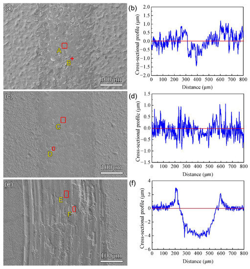 The surface morphologies and cross-sectional profiles of worn tracks after nitriding at 650 °C for 4 h showed that peeling of the hard coating was induced during the wear test. The worn depth and width of F1 film reached 1.5 μm and 200 μm, respectively, as shown in Figure 7a,b. For the nitrided F2 film, only slight scratch marks remained on the modified layer, with a depth and width of only 0.7 μm and 150 μm, respectively. However, the depth and width of the abrasive groove for the nitrided F3 film reached 4.3 μm and 400 μm, respectively. The EDS results for the A-F region in Figure 7 are listed in Table 5. The high O content indicates that oxidation occurred during the wear process. For the nitrided F1 film and F2 film, the N atoms in region B and region D reached 15.9 at.% and 6.7 at.%, respectively, which indicates that the nitrides formed, and this can effectively improve the wear resistance.