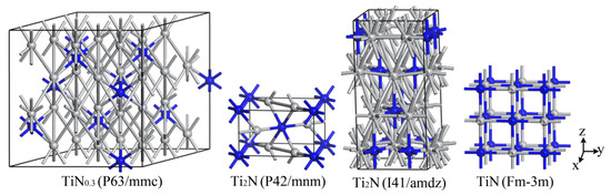 The structure of α-TiN0.3 can be regarded as a solid solution of N atoms in the close-packed hexagonal structure of α-Ti. A 3 × 3 × 2 supercell is built based on the microstructure of α-Ti, where 11 nitrogen atoms occupy the octahedral space in the Ti36 super crystal cell without changing the lattice geometry of Ti36, forming Ti36N11 to describe the α-TiN0.3 phase. The crystal structure models of the Ti-N system are shown in Figure 9.
