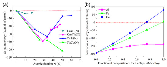 (a) The change in the solution energy for N in Cu-Ti intermetallics; (b) the formation enthalpy of Ti(1−x)MxN.