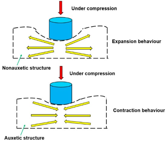 In our previous work [10], we reviewed numerous recent studies on the development of elastomeric bridge bearings using fibre reinforcement (fibre-reinforced rubber bearings, FRRBs), which exhibit improved mechanical properties [11,12,13,14,15,16,17,18,19,20,21,22]. In contrast to LRBs, the fibre reinforcement used in FRRBs offers such benefits as light weight, lower stresses in bearings, and simple installation [10]. Nevertheless, the materials used in these bearings, whether reinforced by steel or fibre, can be better designed in order to obtain specific properties under expected loading conditions using metamaterials which cannot be found in nature [23,24]. Their properties are obtained from the structural design rather than from their constituent materials. Recently, many researchers have investigated auxetic structures used for sandwich cores in a range of engineering applications. Auxetic structures possess the novel property of a negative Poisson’s ratio (PR) [9,25,26]. Negative PR materials are well-known for their excellent of lateral contraction behaviour and resistance to expansion when exposed to compression and tension, respectively [27,28,29,30,31,32,33,34]. While common natural materials, also referred to as positive PR materials, exhibit swell behaviour perpendicular to compressive loading and contraction behaviour under tensile loading, as given in Figure 1 [25,35], these auxetic materials provide a wide range of engineering advantages with superior mechanical properties such as shear resistance [9], higher fracture toughness, lower fatigue crack propagation [36,37,38,39,40,41], vibration mitigation [42], indentation resistance [43], crashworthiness [44,45], light weight [46], energy absorption [47,48], etc.