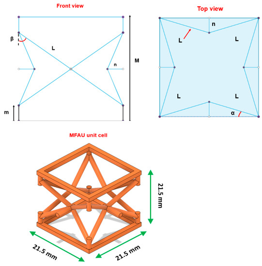 In this section, the designed MFAU cell model of a sandwich core for bridge bearing is provided, as shown in Figure 2. It is characterised by a re-entrant shape and selected for its negative Poisson’s behaviour. Additionally, the selection of this structure is based on a relatively simple design that which is able to be produced by additive manufacturing. The MFAU cell has a three-dimensional geometry developed from a well-known two-dimensional re-entrant auxetic unit (AU). The benefit of using a 3D AU cell is that it allows for biaxial response in all loading directions, instead of the common uniaxial response of a 2D AU cell [63,64]. Compared to honeycomb structures, the MFAU cell designed in this paper is a truss-like structure for bridge bearing applications. Importantly, it maintains its auxetic behaviour at high strains, which is required for the exceptional loading conditions of bridge bearing designs. The configuration parameters used in this MFAU model include the length of the diagonal strut L, and two angles, β and α. The dimensions of the AU cell model are depicted in Figure 2, where L = 12.57 mm, β = 56.16°, and α = 37.30°. To avoid contact between the beams and ensure effective auxetic behaviour, these angle parameters are limited. The height of the beams set in the vertical direction is represented as m = 3 mm, while the connective beams set in the horizontal direction can be determined as . The eight struts of the upper and lower bases have a square cross-section of width, w = 1.50 mm. Unlike the other beam components, they have a circular cross-section of radius, a = 1.50 mm. The MFAU cell has a square base, and the width is determined as . The whole height of the model is , and the whole width is . The thickness of all components is 1.50 mm. As demonstrated in Figure 2, the three-dimensional MFAU cell structure is 21.50 × 21.50 × 21.50 mm in size.