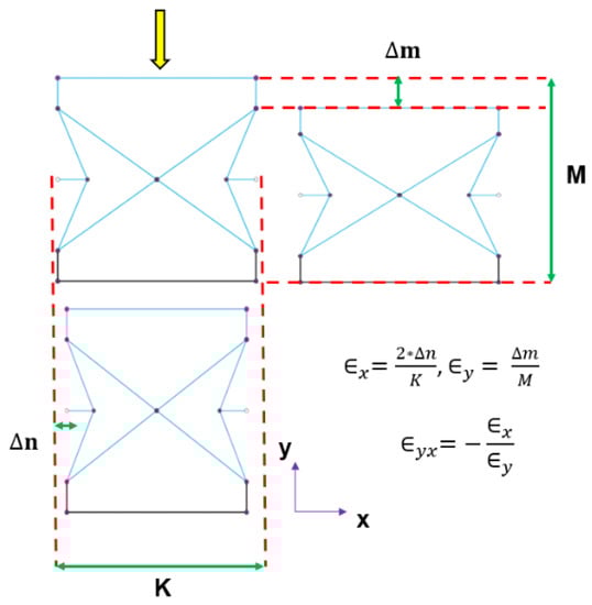 Poisson’s ratio (PR) was first introduced by Simeon Dennis Poisson [65]. In this paper, the effective PR of the MFAU cell model is defined as the ratio of transverse engineering strain, induced by the lateral deformation, to axial engineering strain, which is induced by the vertical deformation. Figure 3 illustrates the procedure for determining the effective PR of the model. The lower base is simply supported in the vertical direction, while a uniform static force is applied on the upper base of the MFAU cell model.
