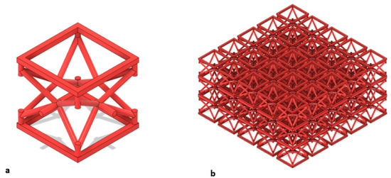 To conduct numerical analysis, two 3D CAD models for the MFAU cell and MFA composite bridge bearing using a sandwich core (5 × 5 × 3 unit cells) were generated by Fusion 360 software, as shown in Figure 4. Then, a 3D finite element method-based approach using Siemens NX 12.0 Nastran (Siemens, Munich, Germany) software was followed in order to simulate the analytical buckling analysis on the two column components (vertical and diagonal) of the MFAU cell, as shown in Figure 5c.