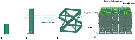 Two 3D column finite element models with the same boundary condition used in the analytical analysis (free–fixed) were produced, with 1925 and 5872 tetra10 elements for the vertical and diagonal columns, respectively. These two solid element models had a very refined mesh (0.2 mm element size). The compressive load of 1 N was applied to each component in the vertical direction, as shown in Figure 5a,b. When the simulation of the eigenvalue problem was carried out, the obtained buckling load factor, , was used for calculating critical loads for the two components. To obtain the critical loads, the initial compressive loads were multiplied by the buckling load factor, . Furthermore, the numerical investigation included the overall compressive behaviour of the MFAU cell under the highest local critical buckling load obtained. In terms of bridge bearing applications, a full three-dimensional model consisted of 13,319 and 2,301,690 tetra10 solid elements for the MFAU cell and MFA composite bridge bearing model, respectively. Their entire three-dimensional tetrahedral method is presented in Figure 5c,d. Both solid elements models had the same element size, 1 mm. The highest local critical buckling load face was imposed on the top surface of the MFAU cell model; for the other model, the enforced displacement constraint of 4 mm was applied to the top surface of a thin metallic facet connected to the top surface of the auxetic core by using a glue surface-to-surface contact. The base of each model was fixed.