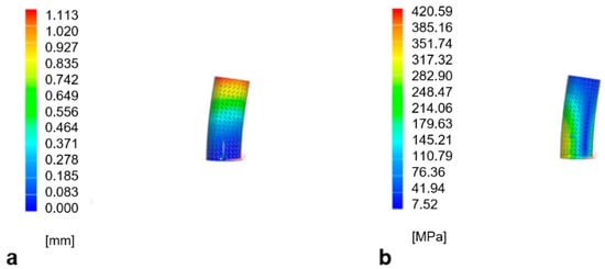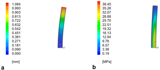 Displacement (a) and stress distribution (b) of the vertical column with free–fixed boundary condition in the buckling analysis.