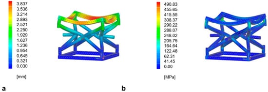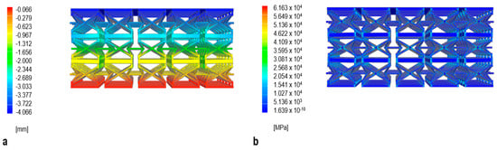 The results of the finite element model calculations in this paper are based on linear Euler buckling theory. Obviously, the numerical results of the critical buckling load analysis for the diagonal column are in good agreement with the analytical solutions, as shown in Table 2, while in the case of the vertical column there is a large difference in the critical buckling load analysis between the numerical and analytical results. This is because the critical buckling load obtained from the FEM tends to overestimate Euler’s critical load when the critical slenderness ratio of a material is higher than that of a column. To address this issue, the nonlinear Euler buckling analysis should be conducted and compared to the critical buckling load obtained from the analytical calculation using the Johnson equation, which is more accurate for the calculation in this case. It is important to mention that in this paper we focus on the linear buckling analysis in order to identify the local failure modes of a meta-functional auxetic unit cell for bridge bearing using a linear isotropic material, which at low strain is TPU. Furthermore, Figure 7 and Figure 8 demonstrate the numerical buckling behaviour (including displacement and stress distribution) of the vertical and diagonal columns with a free–fixed boundary condition under compression, respectively.