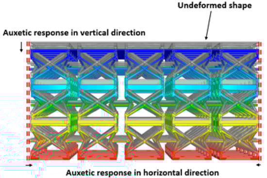 Auxetic deformation behaviour of the meta-functional auxetic composite bridge bearing model in vertical and horizontal directions under compression at vertical displacement of 4 mm.