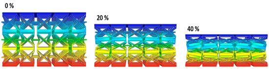 Nevertheless, the value of the critical buckling load of the vertical column is close to the load at the yield point of the TPU material. This means that the failure behaviour of the vertical column can alternately fail in buckling and yielding if the higher load level is applied to the MFAU cell model. While the critical load of the diagonal column is 0.26× of the yield load of the material, the column first shows buckling behaviour in the linear elastic region before yielding as the compressive loading is applied. It is worth noting that the independent buckling behaviour of each component will be provided in the following section through the numerical results.