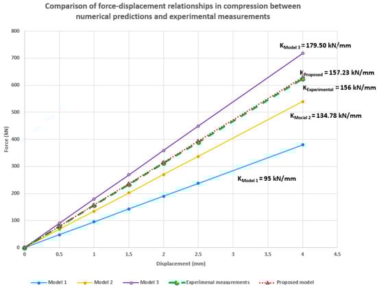A comparison of the vertical stiffness of the meta-functional auxetic composite bridge bearing model, with different Young’s moduli and a common bridge bearing at the vertical displacement of 4 mm, between numerical and experimental relationships, respectively.