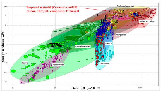 Young’s modulus–density Ashby diagram. The diagram compares the proposed material against alternative materials.