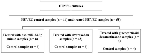 Sixteen HUVEC control samples were used in this study for gene expression analysis. A total of 55 samples of HUVECs were treated with drugs (rivaroxaban and dexamethasone) or miRNA (Figure 2). The expression of CYP4F2, but not HNF4α, PXR and CAR was determined in all control samples (n = 16) of HUVECs.