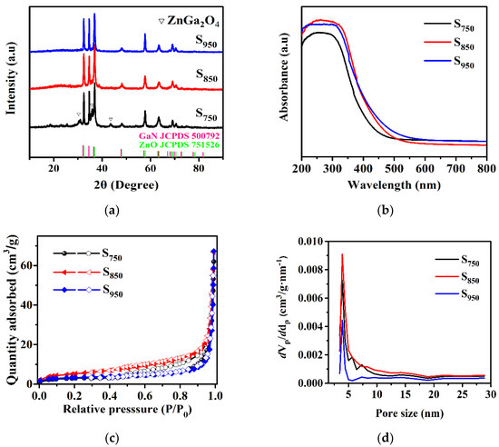 (a) XRD patterns; (b) UV-visible absorption spectra of the S750, S850, and S950 samples; (c) adsorption-desorption isotherms; and (d) pore size distribution of GaN:ZnO solid solution.