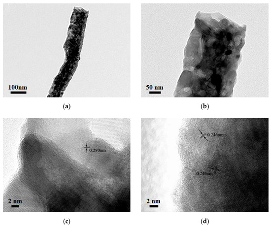 Figure 2a–d show the SEM images of Ga(NO3)3-Zn(NO3)3/PAN, S750, S850, and S950. Ga(NO3)3-Zn(NO3)3/PAN nanofibers with diameters of around 180 nm, which possess continuous uniform and unblemished smooth structures. Figure 2b shows a broken fiber morphology of S750, which can be attributed to the rapid escape of the gas-phase product during the calcination process. In addition, some agglomerates annexed to the fibers’ surfaces, which can be assigned to the ZnGa2O4 residues, and this is in good accordance with the XRD analysis. S850 exhibited a square rod-like structure consisting of nanoparticles and no agglomerates residues were found on the surfaces of the nanorods (Figure 2c). As for S950, the nanoparticles that make up the nanorods grew larger due to to the excessive nitridation temperature as can be clearly seen in Figure 2d. The EDS result (Figure 2e) of S850 evidently confirms the successful synthesis of GaN:ZnO solid solution. The corresponding TEM images of S850 further revealed that the nanorods consisted of nanoparticles, as shown in Figure 3a,b. Clear distinct crystal fringes of d = 0.280 nm and d = 0.246 nm were observed in the HRTEM images of S850, as illustrated in Figure 3c,d, which correspond to the (100) and (101) planes of GaN and ZnO, respectively.