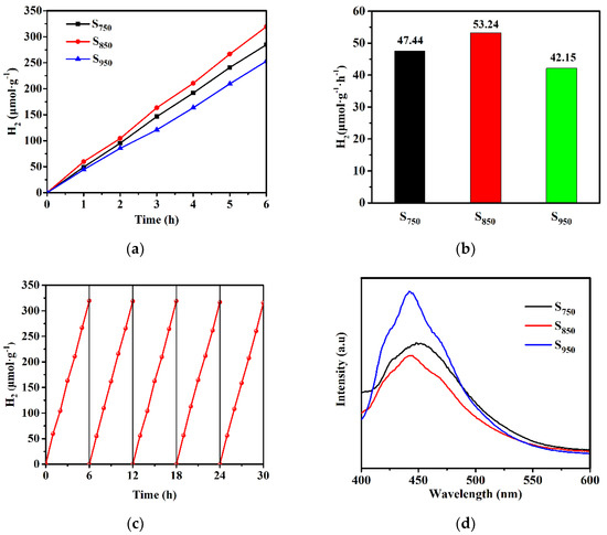 The photocatalytic performance of GaN:ZnO solid solution was evaluated by water splitting for H2 production under visible light. Figure 4a shows the production of H2 of the water splitting reaction on Rh2-yCryO3-loaded GaN:ZnO solid solution under xenon lamp irradiation (λ > 400 nm). The H2 evolution performance rate in 6 h is presented in Figure 4b, and the average evolution rates of H2 for S750, S850, and S950 were about 47.44, 53.44, and 42.15 μmoL·g−1·h−1, respectively. The decreased activity for S950 may be attributed to its nanocrystallite having a larger size, lower BET surface areas, and higher degree of crystallization. As for S750, the lower photocatalytic efficiency can be attributed to the incomplete transformation to GaN:ZnO solid solution, associated with the results of XRD and SEM. In addition, the photocatalytic stability of S850 was evaluated by the recycling test, which is important for the long-term application of photocatalytic materials. As shown in Figure 4c, over five consecutive cycles, the catalyst exhibited negligible loss of hydrogen evolution activity.
