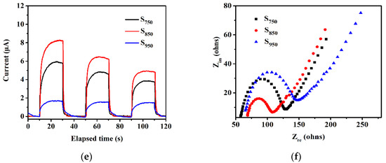 Photoluminescence spectroscopy was employed for the investigation of the charge separation efficiency of the samples in the process of the photocatalytic reaction. Figure 4d shows that the emission intensity follows the order of S850 < S750 < S950. The sequence is the opposite of the photocatalytic activity order. Owing to this, the fluorescence was produced by recombination of the holes in the valence band (VB) and the electrons in the conduction band (CB), and the most diminished PL intensity of S850 indicates that the recombination of photogenerated charge carriers was maximally retarded [41]. Moreover, the photoelectrochemical measurement further supports the transfer and separation behavior of the photo-induced charge carriers of the samples. As shown in the photocurrent response curves and EIS Nyquist plots in Figure 4e,f, S850 displayed the strongest photocurrent density and the smallest semicircle in comparison with S750 and S950, suggesting the lowest interfacial electron-transfer resistance and the highest photo-induced charge transfer and separation efficiency, which leads to the highest photocatalytic performance.