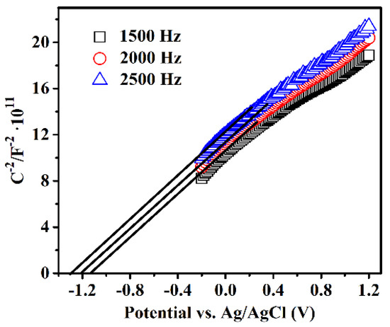 Mott–Schottky plots of S850. Electrolyte: 0.2 M Na2SO4. The different AC frequencies were used for the measurements: 1500, 2000, and 2500 Hz. Tangent lines of the Mott–Schottky plots were drawn to obtain the flat band potential.
