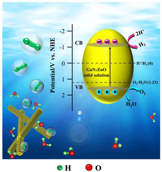 - Maeda, K.; Takata, T.; Hara, M.; Saito, N.; Inoue, Y.; Kobayashi, H.; Domen, K. GaN:ZnO solid solution as a photocatalyst for visible-light-driven overall water splitting. J. Am. Chem. Soc. 2005, 127, 8286–8287. [Google Scholar] [CrossRef] [PubMed]