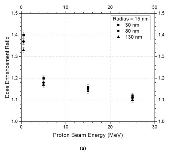 Considering the simulation geometry of the gold nanoparticle with size of 25 nm (radius) and a distance of 80 nm from the DNA (Figure 2a), it is found that the DER value decreases from 1.74 to 1.21 with an increase of proton beam energy. The higher energy deposition at the DNA with lower proton beam energy is due to the energy of secondary electrons. These low-energy secondary electrons from the gold nanoparticle, irradiated by the low-energy proton beam, cause more electron scatter between the nanoparticle and DNA molecule. This leads to more secondary electrons to reach the DNA and produce energy deposition. When a high-energy proton beam irradiates the gold nanoparticle, the secondary electrons generated have higher energy and may pass through the DNA without energy deposition. It should be noted that as the DNA is positioned in the downstream of the proton source behind the gold nanoparticle, and only the secondary electrons moving towards the DNA direction (i.e., from left to right in Figure 1) would cause a dose enhancement and therefore an increase of DER value. In addition, it can be seen from Figure 2 that the decrease of DER value from the low-energy proton beam (e.g., from 0.5 to 5 MeV) is more significant than the high-energy beam (e.g., 5 to 25 MeV). This is because the secondary electron scatter is particularly more significant at a low proton energy (0.5 MeV). When the proton energy is in the range of 5 to 25 MeV, the decrease of DER value is only slight, as shown in Figure 2.