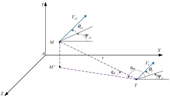 The relative motion relationship between the missile and the target is shown in Figure 1. Herein, M and T represent the missile and the target, respectively. The ground inertial coordinate system is expressed in the A-XYZ plane. This is the relative distance between the missile and the target, is the line-of-sight elevation angle and the line-of-sight azimuth angle, represents the trajectory inclination angle and the trajectory deflection angle of the missile, and represents the trajectory inclination angle and the trajectory deflection angle of the target. Unless otherwise specified, all angles were positive counterclockwise.